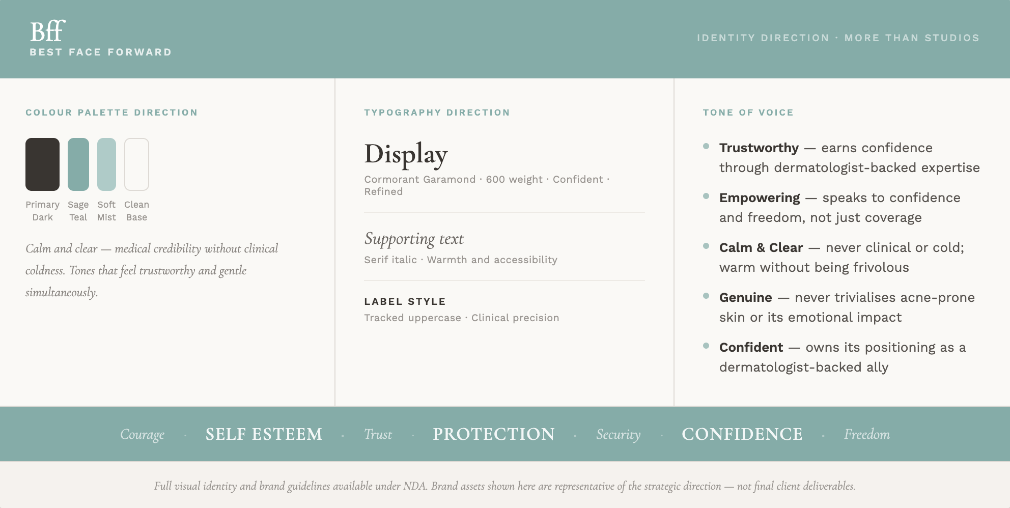 The visual identity was developed after the strategy was fully locked. Colour, typography, and tone of voice all flow directly from the brand DNA, each decision traceable back to the strategic foundation.